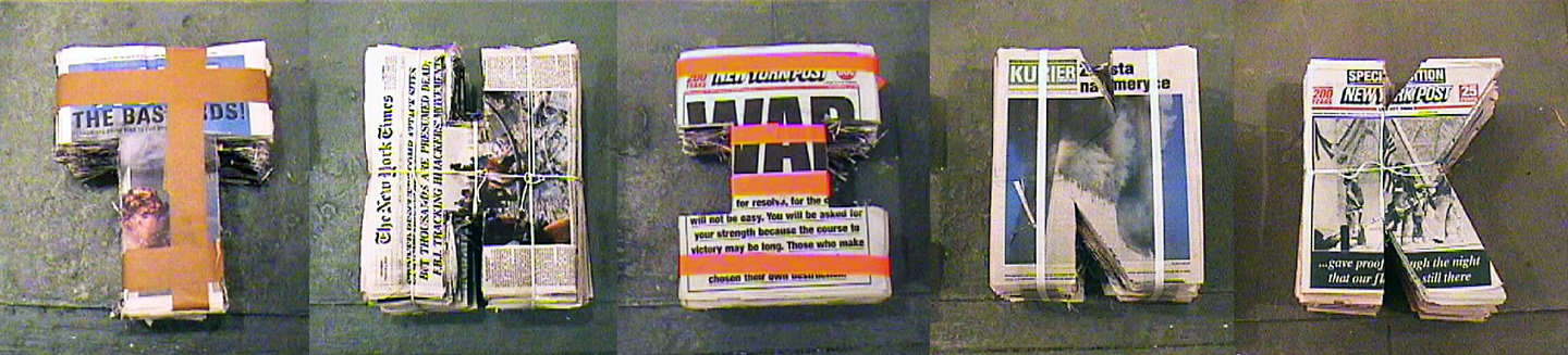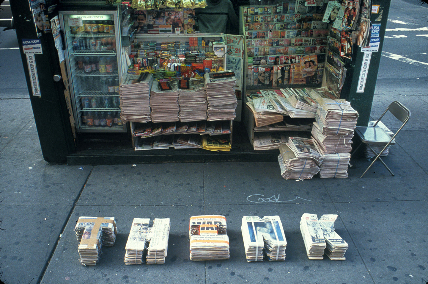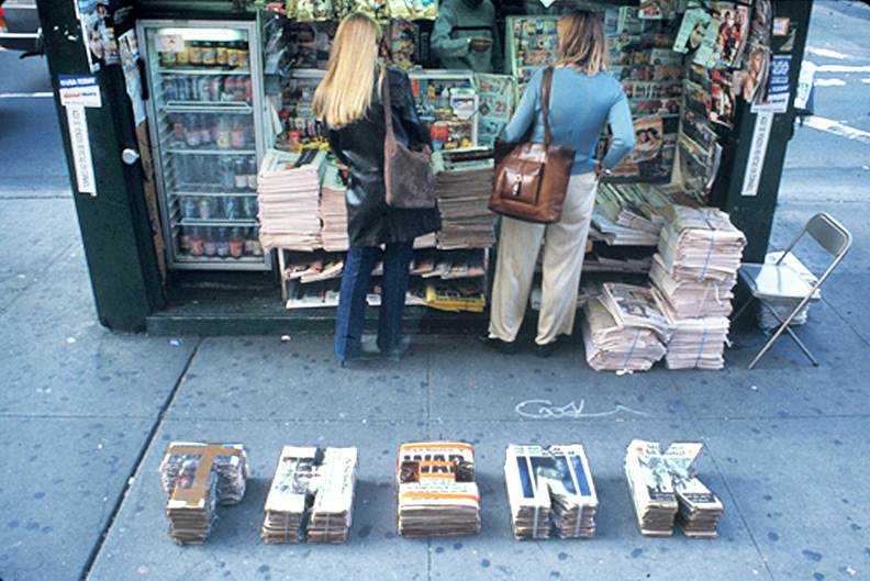 THINK, 2001-02, Union Square newsstand (in collaboration with Norma Markley), bundled newspapers, dimensions variable.
